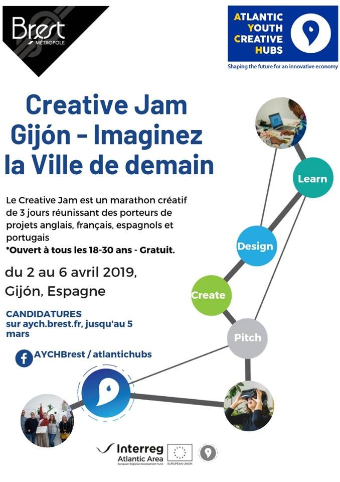 Du 2 au 6 avril prochain, participez au Creative Jam de Gijón, en Espagne. 3 jours de marathon créatif pour imaginer les projets qui amélioreront la ville de demain, avec des jeunes français, espagnols, britanniques, portugais. Ateliers, hackathon, rencontres, échanges: 5 places sont proposées par Brest Métropole aux jeunes brestois de moins de 30 ans !