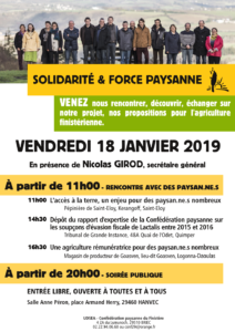La Conf’29 organise une journée de rencontre ouverte à toutes et tous, et une soirée publique à Hanvec, à partir de 20h00, le VENDREDI 18 JANVIER 2019. En présence de Nicolas Girod, secrétaire national de la Confédération paysanne.