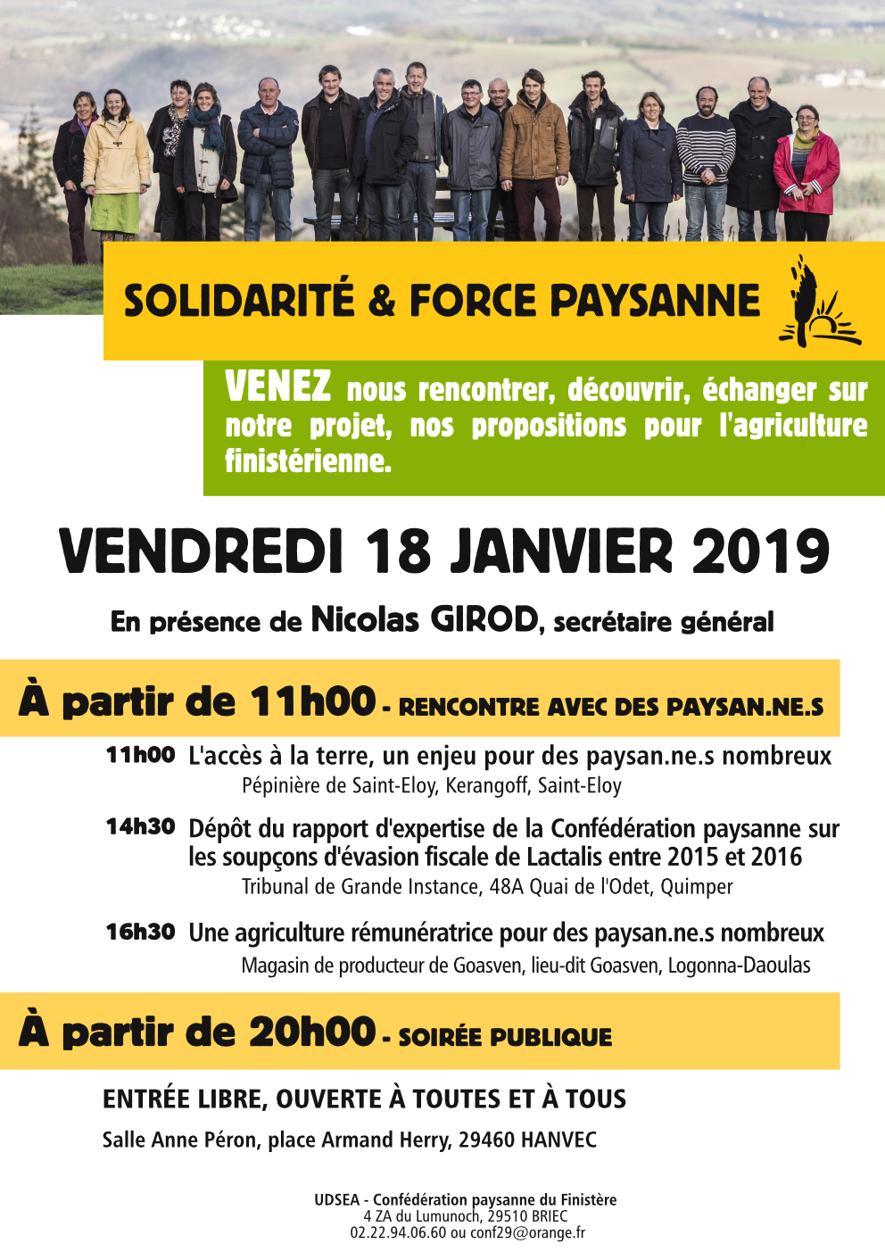 Nous terminerons cette journée, par une soirée publique à Hanvec (salle Anne Péron, place Armand Herry), à partir de 20h00, où nous vous présenterons nos propositions pour la chambre d’agriculture et Nicolas Girod interviendra pour présenter les engagements de la Confédération paysanne.  La soirée sera suivi d’un buffet paysan.